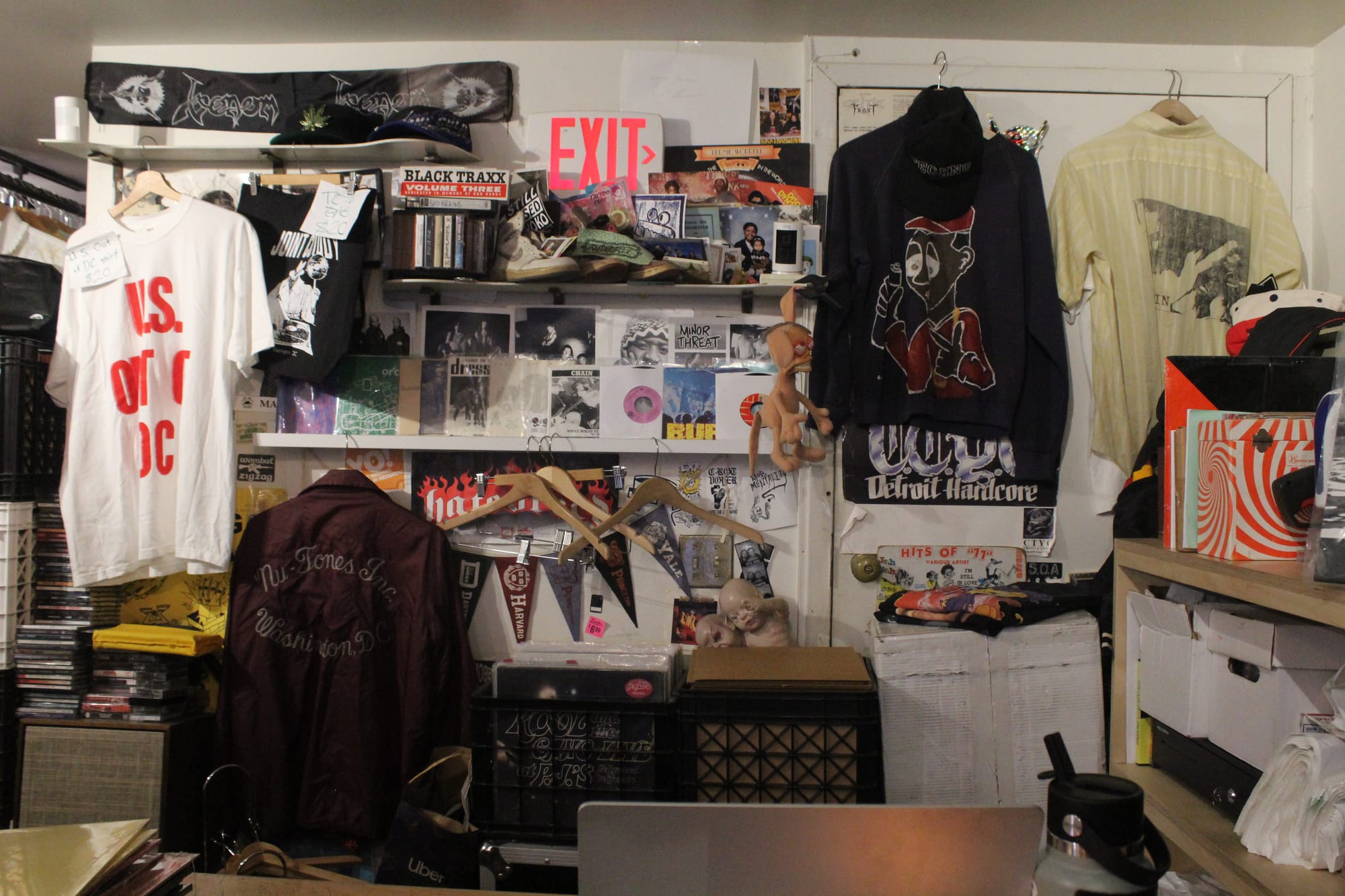 The store is full of used and new records ranging from heavy metal to gospel music. Their selection of vintage clothing features sports memorabilia and band merchandise. In the back of the store, there is a selection of VHS tapes, old magazines, and rare fanzines from the 90s and 2000s metal scene.